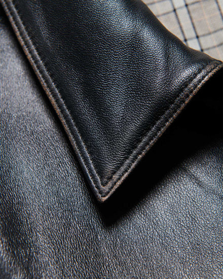 1950~60年代のヴィンテージアイテムのような風合いを特殊な染色によって実現したレザーカーコート。柔らかで保温性のあるシープレザーは長く着続けるほどに味わいが増し、身体により馴染んでいきます。裏地にコットンチェック地を採用することでレトロUKパンクのエッセンスを盛り込むなど、クラシックなアイテムをUEらしくモダナイズしています。