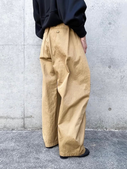 ウエストを畳んだように大きなタックを2本入れてシルエットをつくったデザインのパンツ。