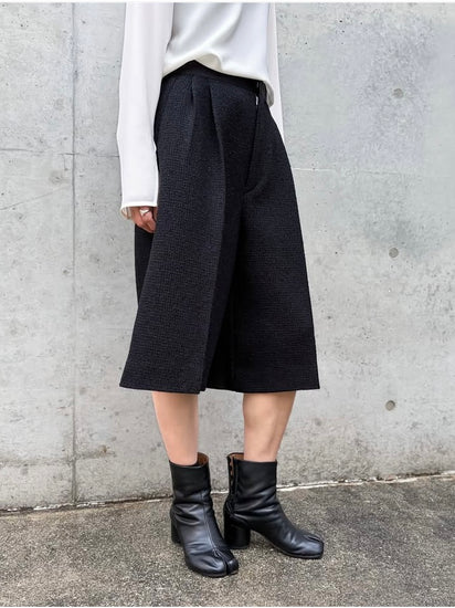 ブラックのブークレツイード素材で仕立てたタックバミューダパンツ。