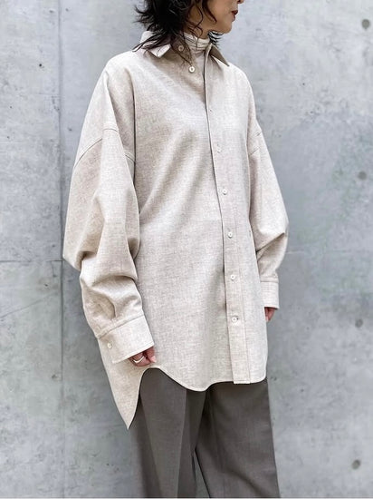 あたたかみのあるメランジカラーの素材が映えるオーバーサイジングのシャツ。