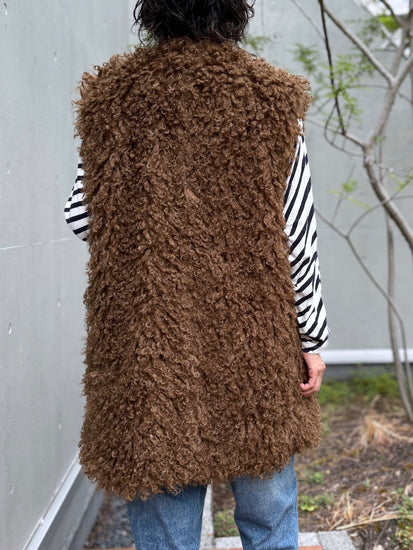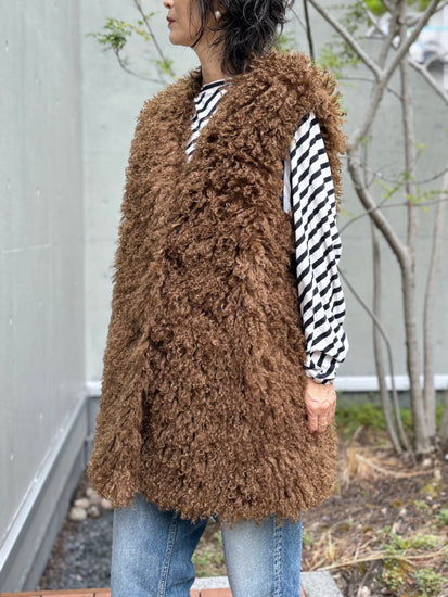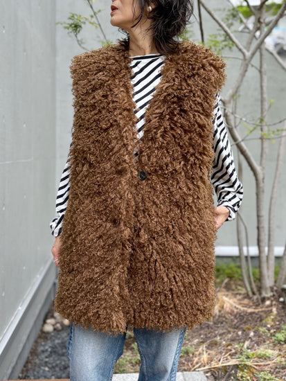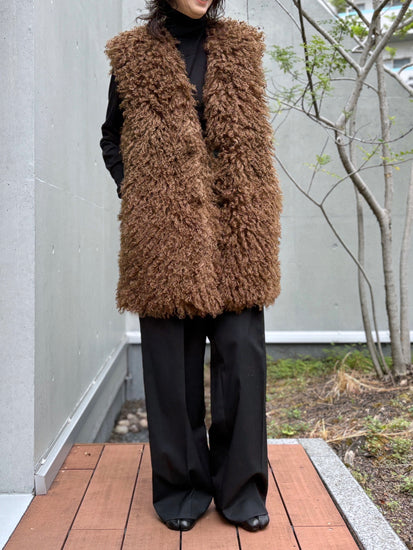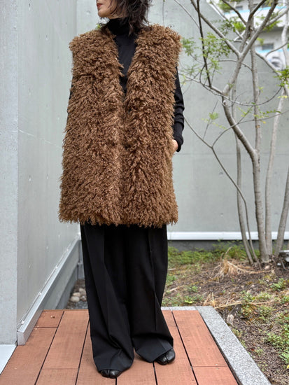 毛足を長くカールさせた立体感あるファー素材を使用したベスト。