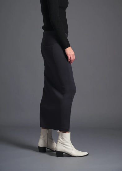 ストレートタイプのペンシルスカートは、ドローストリングでウエストを調節し、サイドのラインが少し前に来ることでスリムな印象に