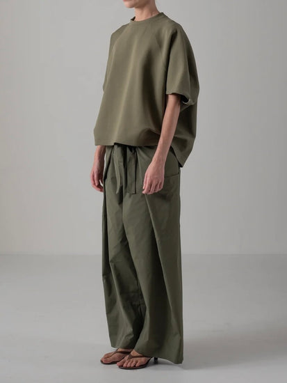 前身頃に対して大胆に分量を取った後ろ身頃が、袖口と裾に入れたタックによってふくらみを生み、独特のシルエットを描きます。