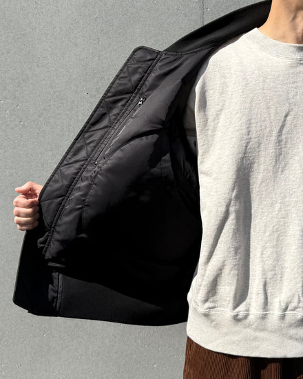 アメリカ軍の初期型MA-1フライトジャケットを彷彿とさせるダウンジャケットをアレンジ、袖をデタッチャブル仕様にし、ベストとしても着用が可能なデザインに昇華。フライトジャケットのディテールである、酸素マスクを留めておくためのオキシジェンタブは胸ポケットに、両脇に備えられた当時ICSの音声プラグコードの固定用コードループは釣果を記載する際の1本分のペン差しとしてそれぞれアレンジ。インナーには複数のインサイドポケットを配しており、十分な収納力を持ち合わせている。ミリタリーのディテールでもある前振りの袖がデザインアクセント、アクションプリーツを加え、腕の可動域を広げられるように考えたデザイン。