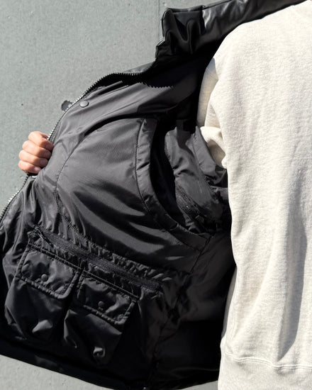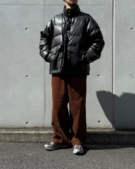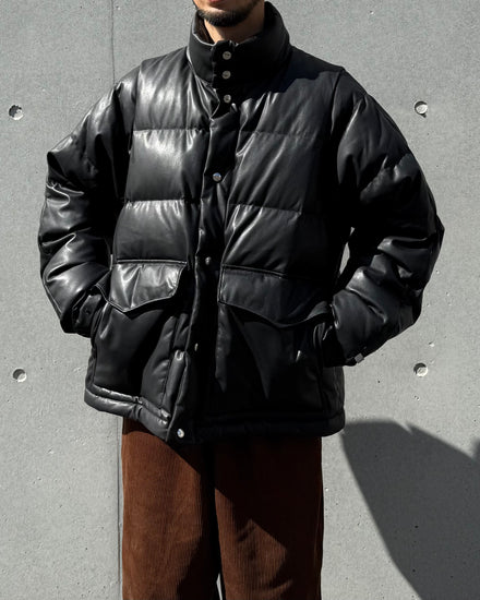クラシカルなアウトドアダウンジャケットをシンセティックスキンにて作成したモデル。まるでレザーのような雰囲気を醸し出すこのモデルは、外観とは裏腹に軽量に仕上げているのが特徴。アクションプリーツのデザインをアレンジし、袖が取り外し可能なディテールワークを加えている。ダウンベストとしても着用が可能な万能アイテム。インナーには複数のインサイドポケットを配しており、十分な収納力を持ち合わせている。ミリタリーのディテールでもある前振りの袖がデザインアクセント、アクションプリーツを加え、腕の可動域を広げられるように考えたデザイン。