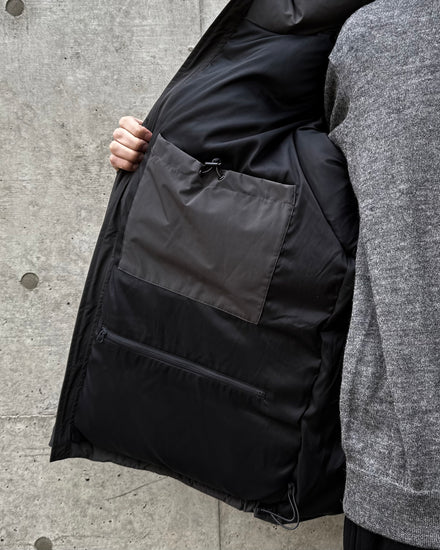 山岳探検家が着用するシンプルなダウンジャケットをアレンジ。フロントからサイドに大きくデザインしたフラップポケットはハンティングジャケットのポケットディテールを採用。インナーには複数のインサイドポケットを配しており、十分な収納力を持ち合わせている。取り外し可能なフードを備える。