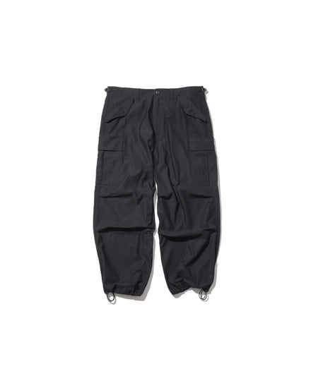 1960年代のミリタリーパンツをベースに製作したM-65フィールドパンツ。生地はオリジナルに限りなく近いバックサテン生地を採用。加工を加えることで使い込まれた風合いを表現。アルミのジップやカーゴポケット、止血テープなど、細かいディテールも再現しています。ウエストのサイドアジャスターはゴムでつなぎ合わせる事により、腰周りの伸縮性が増し快適な着心地を実現。裾のドローコードにはストッパー設けシルエットの調整を容易にしました。ミリタリーウェアとしての機能はそのままに、現代の都市生活におけるワードローブとして生まれ変わった一本です。