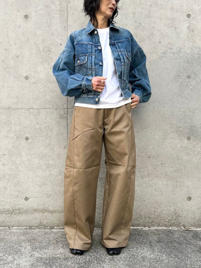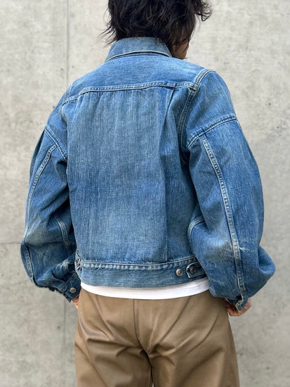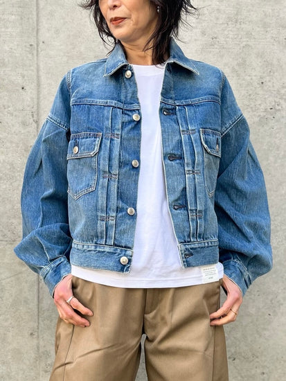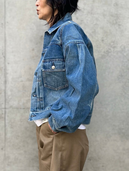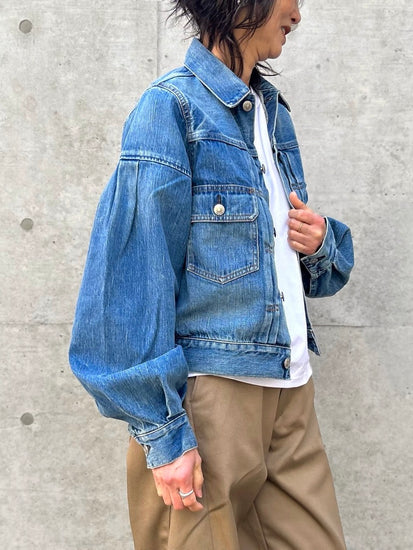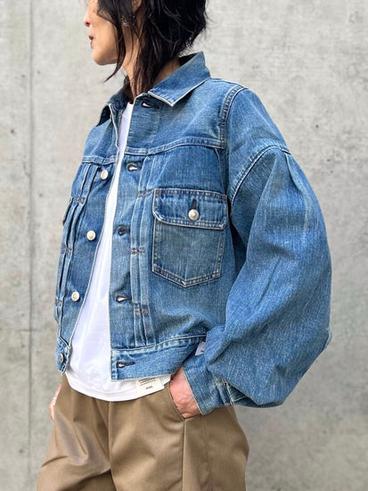 レギュラーシルエットにバルーンスリーブを組み合わせたデザインで、ヴィンテージ感のある凹凸の表情が特徴です。旧式力織機で織られた生地を使用し、クラシックなデニムジャケットの風合いを再現。合わせるボトムスを選ばず、カジュアルからモードまで幅広いコーディネートに活躍します。