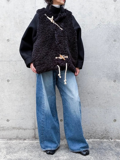 12オンスのデニム生地を使用した<ハイク>のジーンズ。凹凸感などヴィンテージデニムの表情を出すために、旧式の力織機を用いて織り上げました。フロントはクラシカルなボタンフライ仕様。