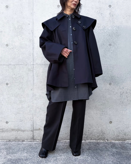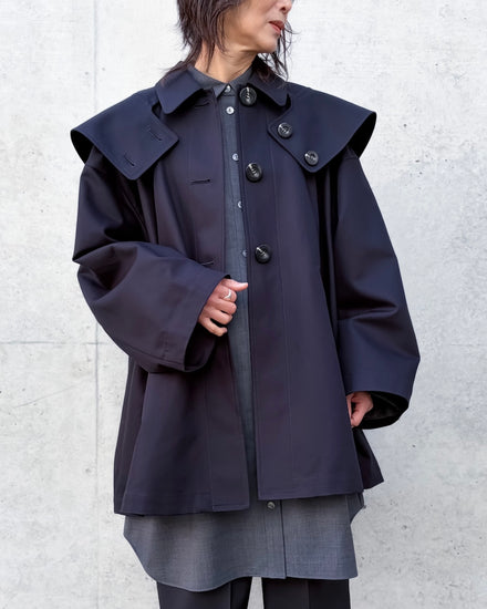 大きめのフードデザインにしているため、被らない時は大きい衿のような新鮮な見え方をし、スタイリングのアクセントになります。