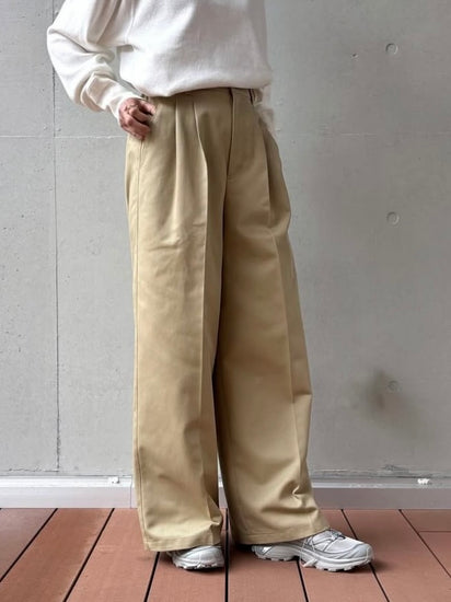 前後にセンタープレスを入れることで太めのストレートシルエットでもすっきりとした印象のパンツアイテム。