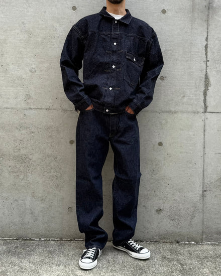 1936年以前のデニムジャケットがベース。このジャケットは小釦と言われる通常より1回り小さい釦が使用されているほか、襟も小さく、丸みのある歪んだ形状のポケットフラップなど随所のディテールが極めて特徴的。このタイプのT-BACKディテール*は特別に希少。 今回はあえて大きめの48サイズを採用したほか、アームホールもやや大きく微調整することで重ね着もしやすくなっている。NMオリジナルデニムを使用。これをNew Manual#012とする。