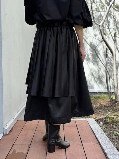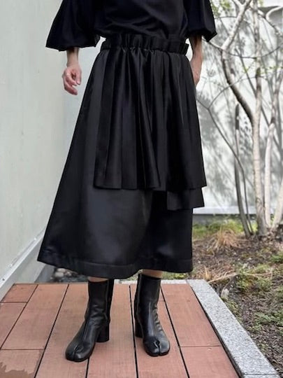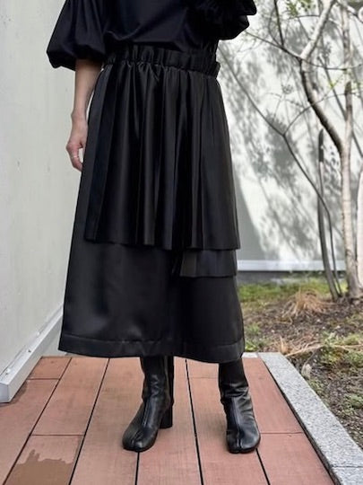シンプルなスカートの上から左右非対称のプリーツのを巻き付けたようなデザインです。