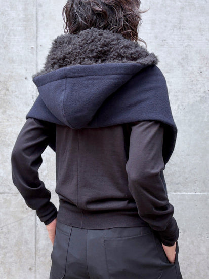 ぐるりと巻き付けるレイヤードフォルムで、フロントはファスナー仕様。カットソーやニットの上にアウターとしても、ストールの様にも使用できる一着です。