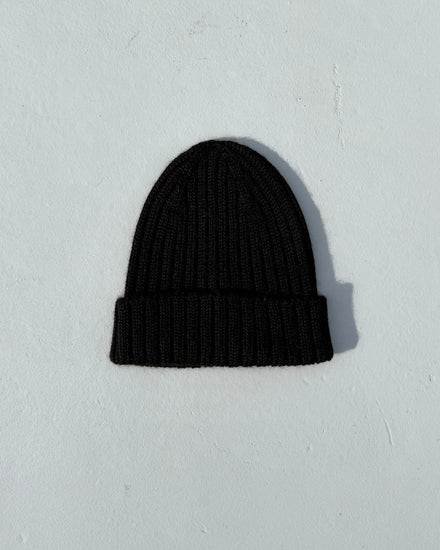 全体の0.01%にも満たない、非常に希少なアルパカウールを贅沢に使用した「ピュアブラックコレクション」から、リブ編みのニットキャップが登場。