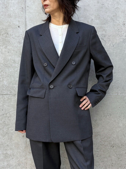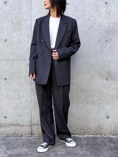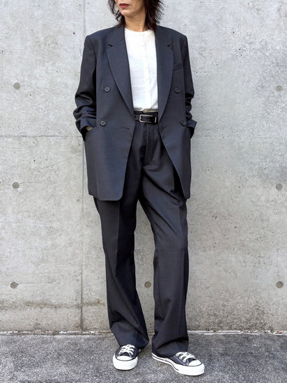 程よい落ち感と張り感を併せ持った、仕立て栄えのする素材です。またシワになりにくいところもポイントです。同素材のパンツとセットアップでの着用もオススメです。