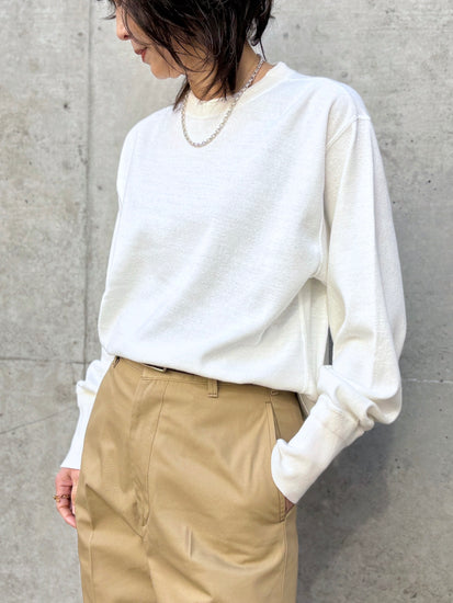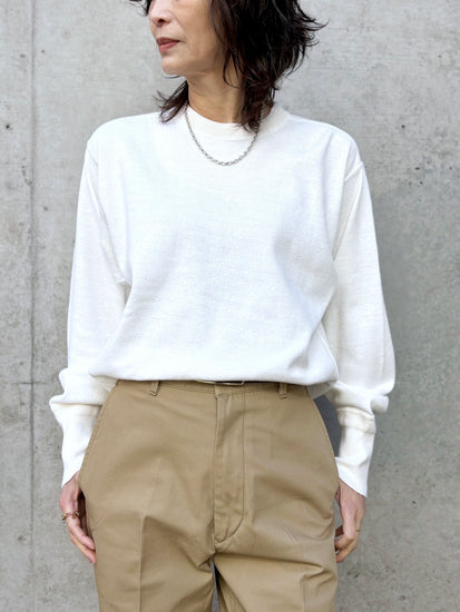ヴィンテージの様な風合いを出したくて、あえて糸カスの残った状態の糸を使用し、フライスでふっくらと編み立てたミリタリープルオーバー。