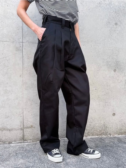 しっかりハイウエストで程よくヒップにボリュームが出る、新しいシルエットを楽しんで頂けます。太もも周りもゆったりとして、脚を綺麗に魅せてくれます。素材はスケーターパンツをツータックにしたイメージで、コットンポリエステルを使用しているのでケアも簡単です。